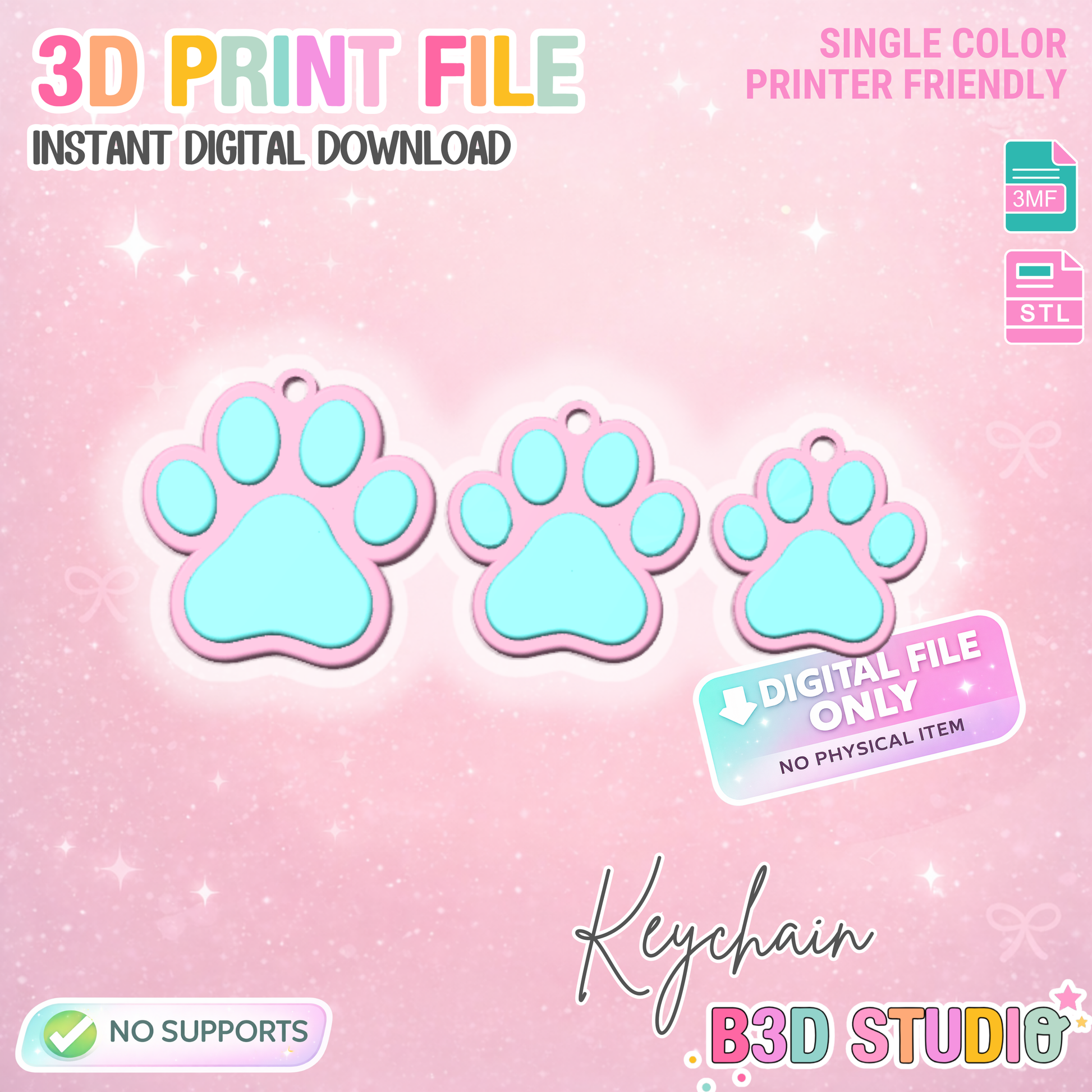 This Digital STL/3MF Download includes a 25, 30 & 35mm versions of this playful Paw Shaped Keychain.