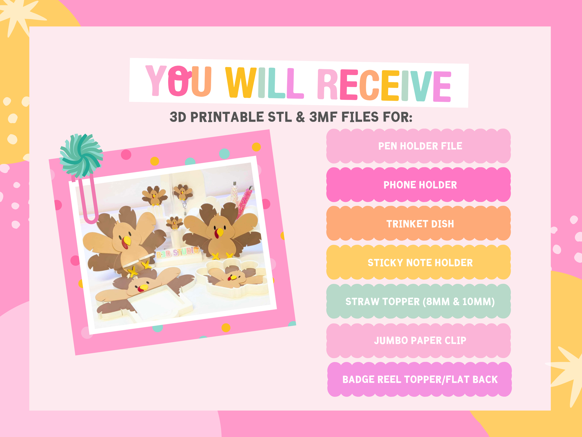 The cutest Turkey 3D Print Bundle 🦃✨ Create cozy fall vibes with a 3D printable pen holder, sticky note holders & more — perfect for Thanksgiving décor or gifts!